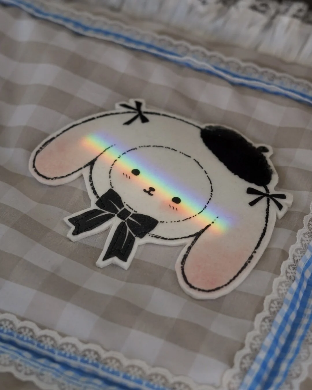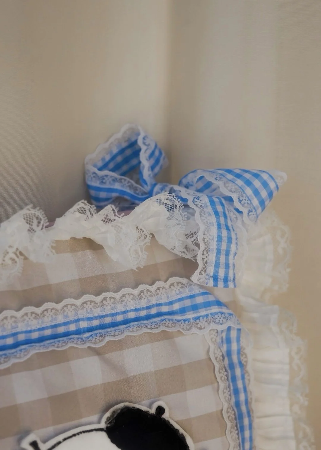 Puffy pillow banner. Multi-coloured felt mixed with details and ruffles on cotton with puffy inside and buttons on the back.